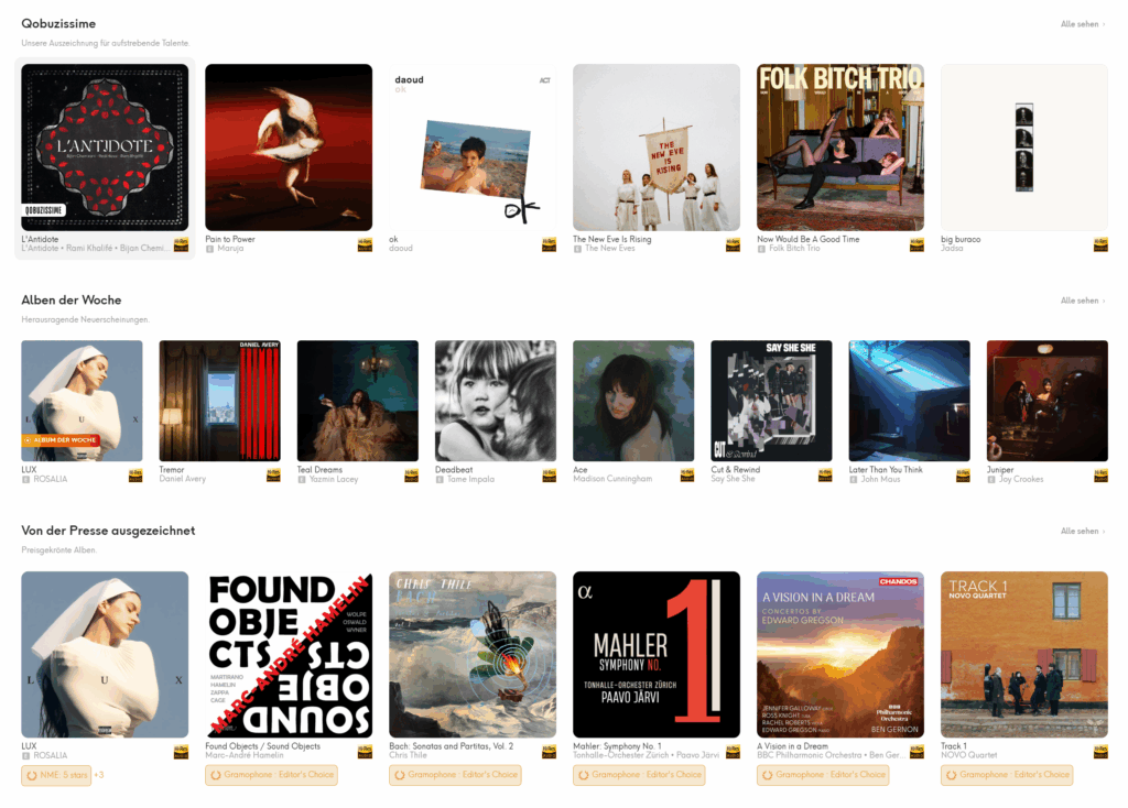 Für mich ist viel rel­e­van­ter, dass bei unge­fähr das Sechs­fache an Geld bei den Künstler*innen ankommt und Qobuz ein musikjour­nal­is­tis­ches Ange­bot inte­gri­ert hat: Zu sehr vie­len Künstler*innen und Alben gibt es kurze, aber fundierte Vorstel­lung­s­texte und/oder Rezen­sio­nen. Auf der Start­seite wer­den zudem manuell aus­gewählte Neuer­schei­n­un­gen angezeigt und auch solche, die ander­weit­ig von Musikme­di­en aus­geze­ich­net wur­den – quer durch alle Gen­res, von Elek­tro über Jazz bis Alter­na­tive und Met­al.